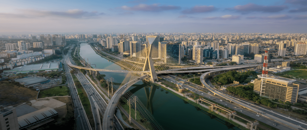 (A picture of roads and bridges connecting two sides of a city across a river.)